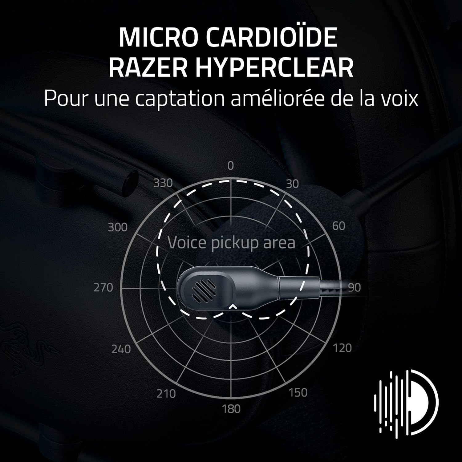 - Micro cardioïde Razer HyperClear - pour une meilleure capture de la voix : Un modèle de prise de son amélioré garantit plus de voix et moins de bruit en s'amenuisant vers l'arrière et les côtés du micro, le point d'écoute étant facilement placé au niveau de votre bouche grâce à la conception flexible du micro.